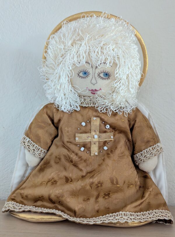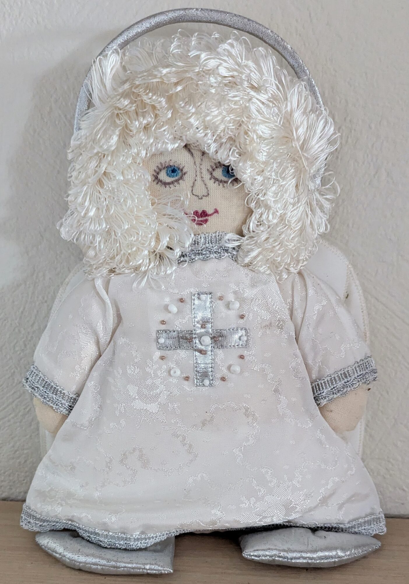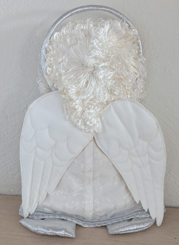 (Français) Joli ange entièrement fait mains par Alexandra en tissu satiné. A poser ou suspendre en décoration. 30 cm de hauteur .