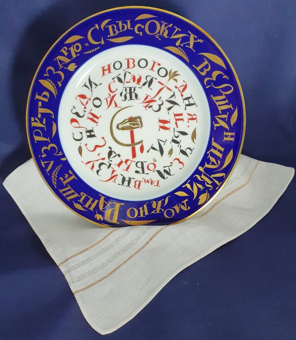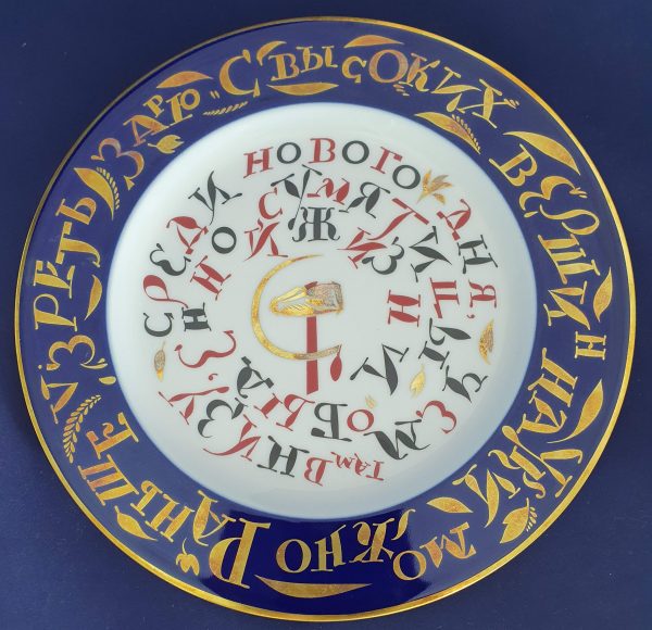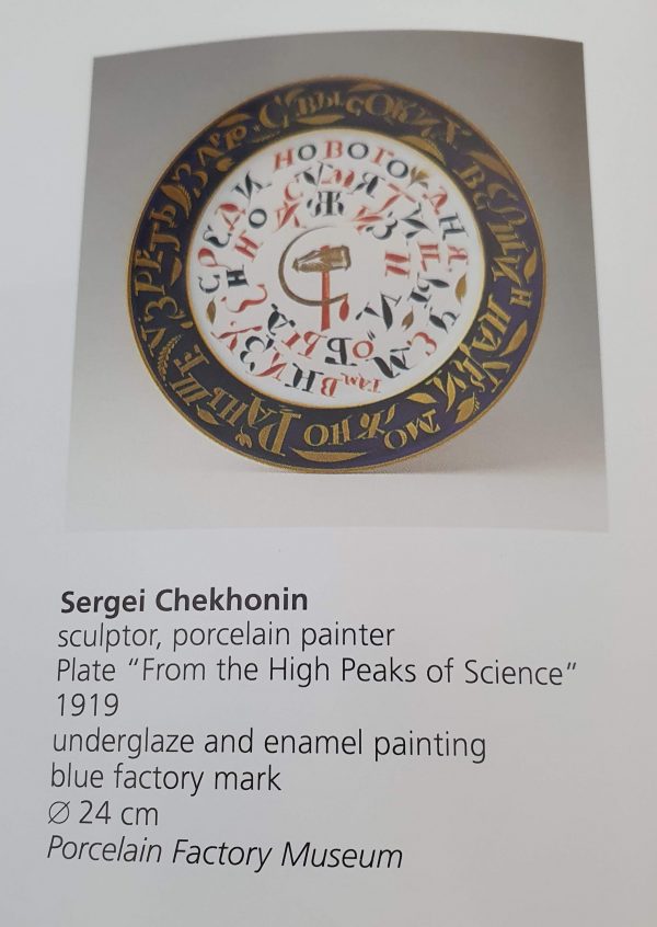 ” ON PEUT VOIR l4AUBE TÔT DES HAUTS SOMMETS DE LA SCIENCE ” Assiette en porcelaine de 24,5 cm de diamètre, créée par CHEKHONIN en 1919  pour la Manufacture Impériale de Saint-Pétersbourg.