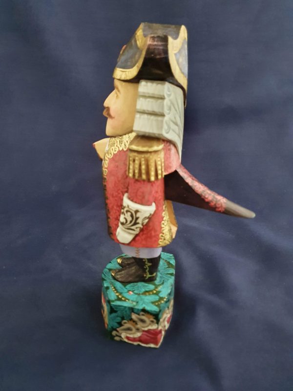 Le sculpteur a beaucoup travaillé ce personnage : costume, visage, cheveux, coiffe, socle,