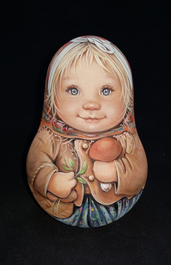 Adorable petite fille peinte sur un culbuto en bois – Elle est heureuse d’avoir trouvé un beau champignon
