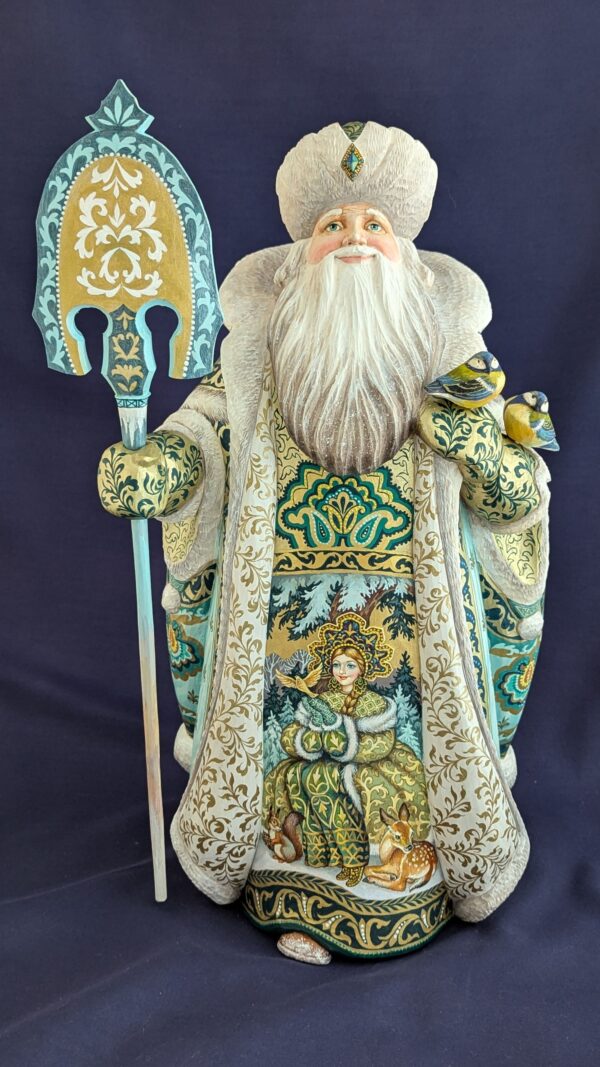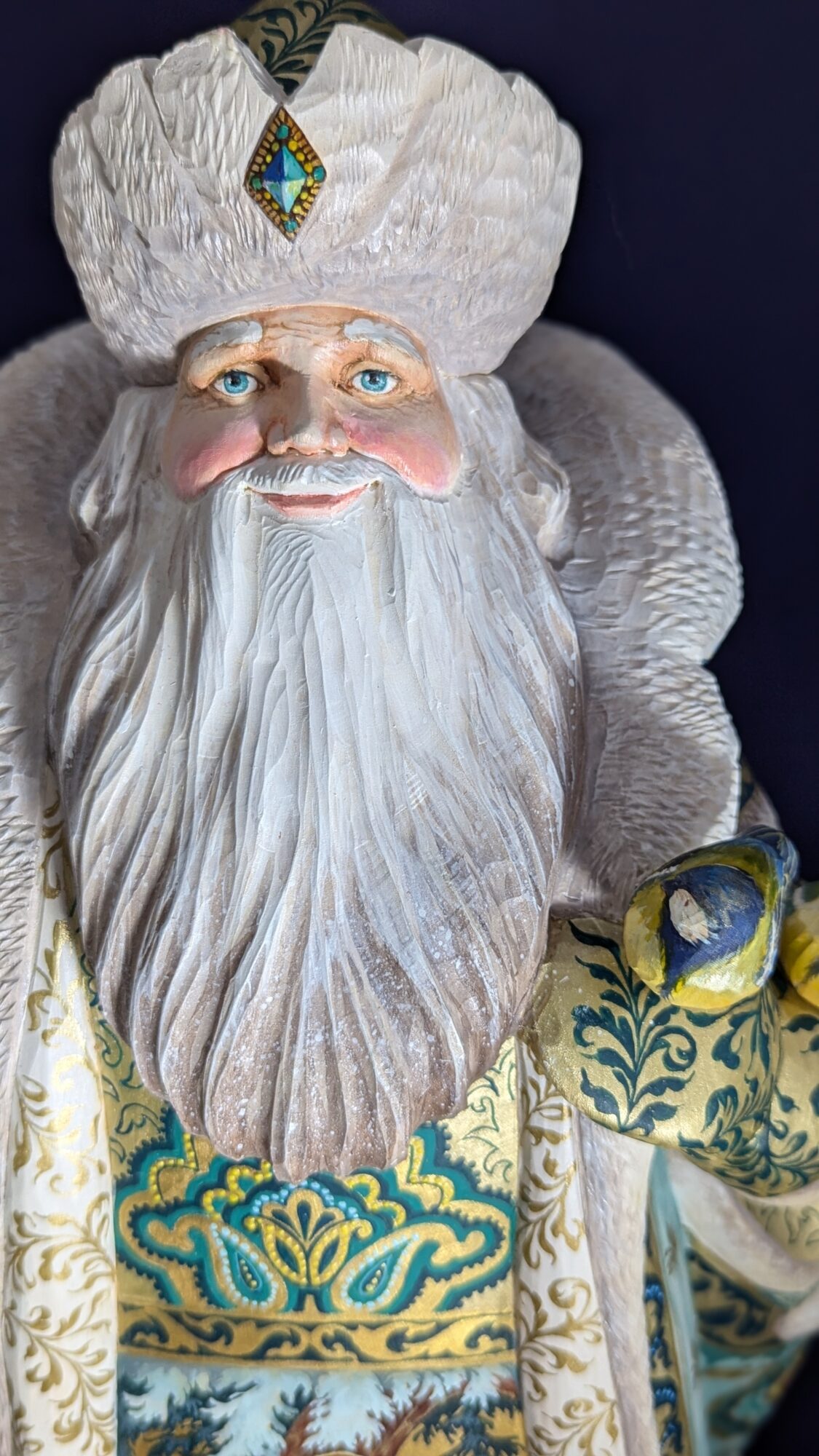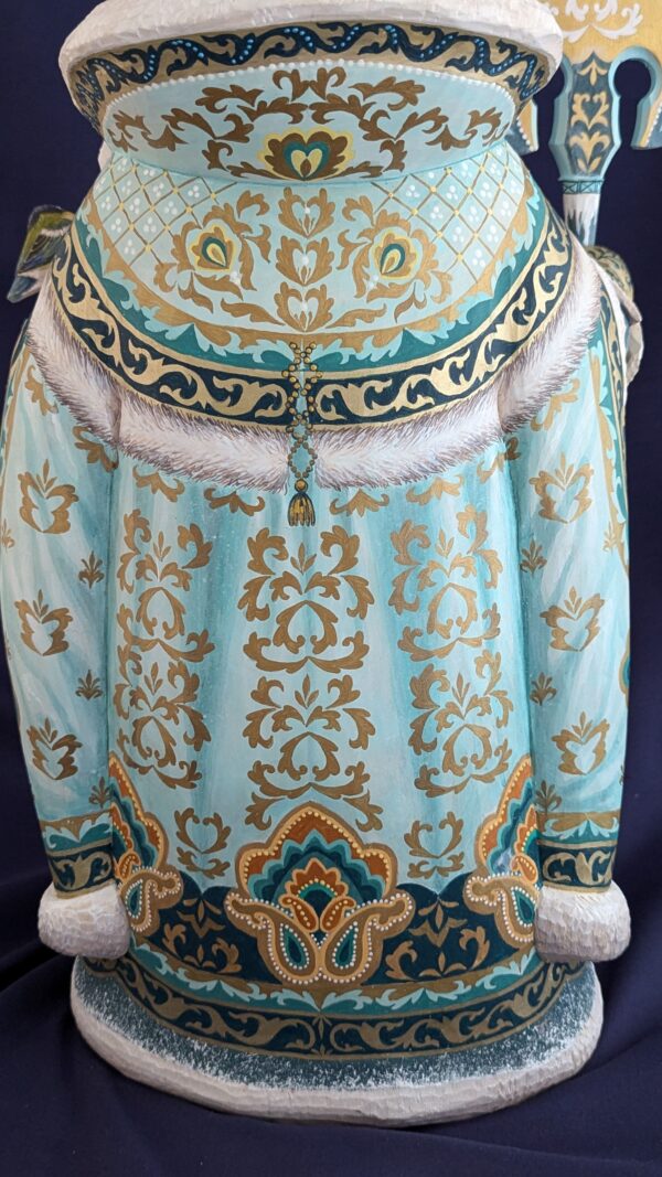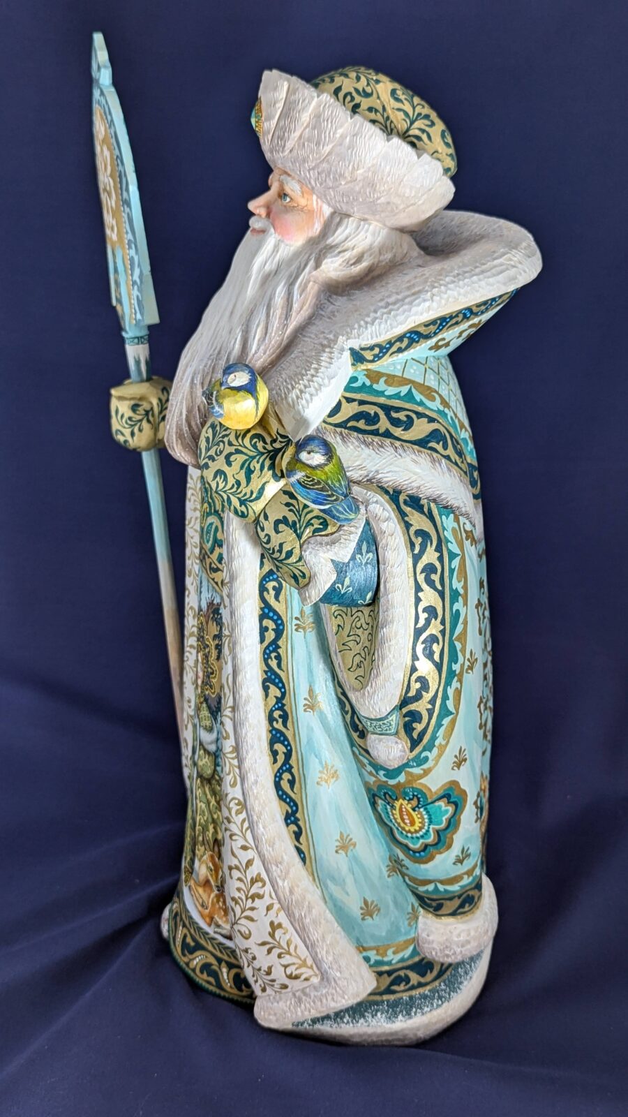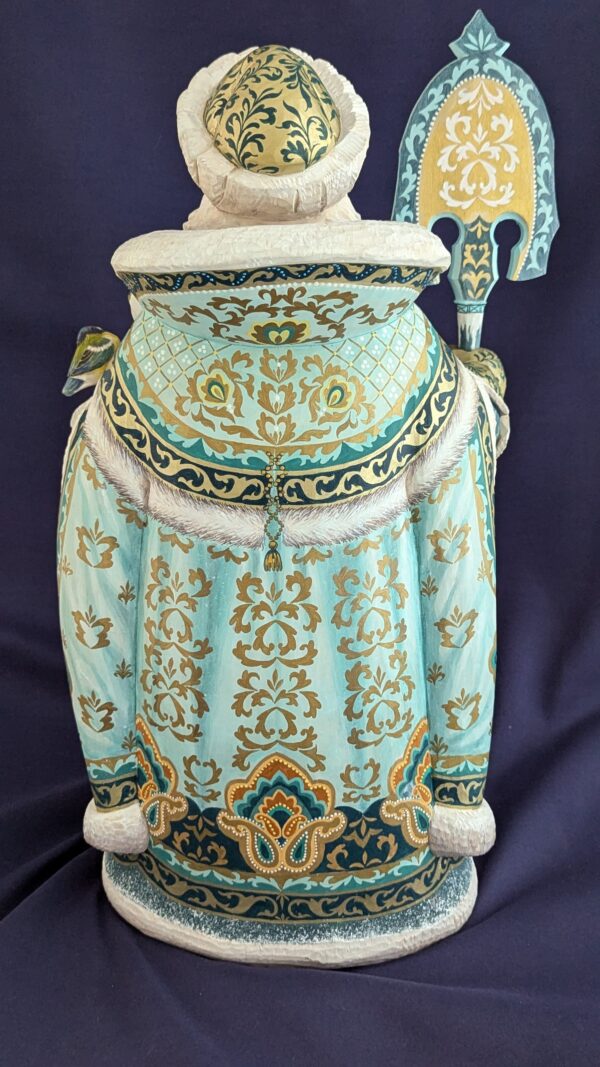 Couleurs de costume très originales, les ors, les verts et les bleus font de ce père Noël