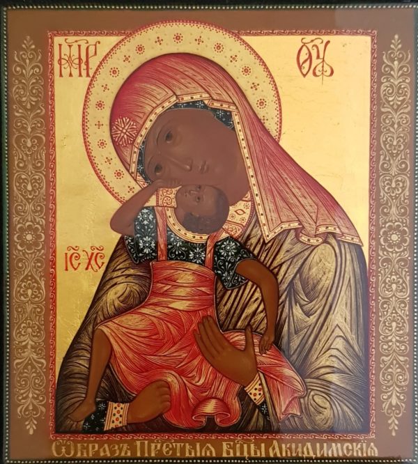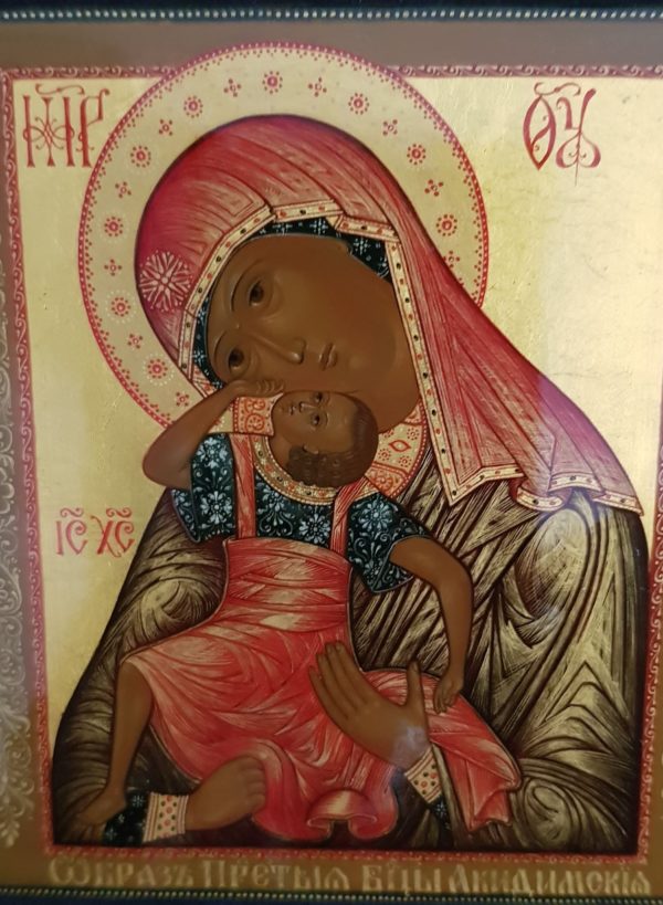 Сette icône représente la Bienheureuse Vierge Marie. L’enfant Jésus est assis dans ses bras. Il joue avec sa mère, la tête rejetée pour la regarder. De sa main, il caresse doucement sa joue, montrant son amour et sa confiance.