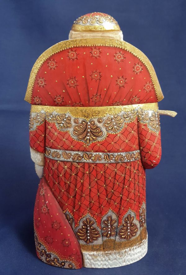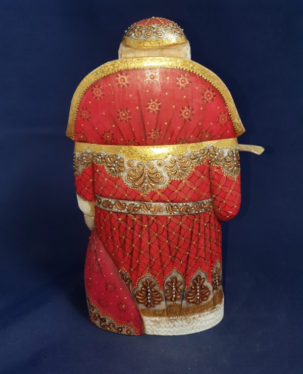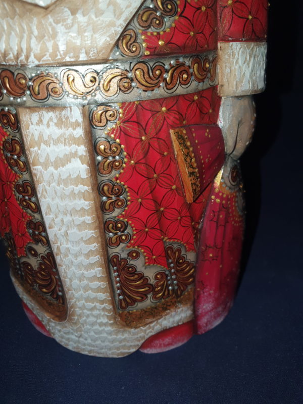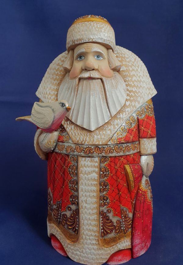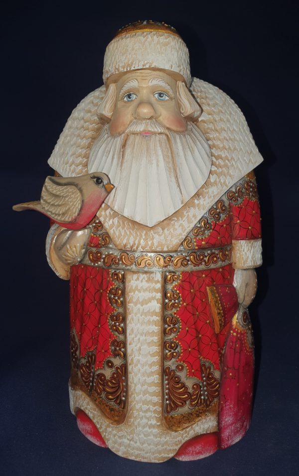 The sculptor made him a tender face in linden wood – a bird in one hand to go with him, and the big bag full of toys in the other.