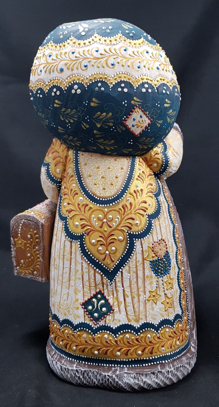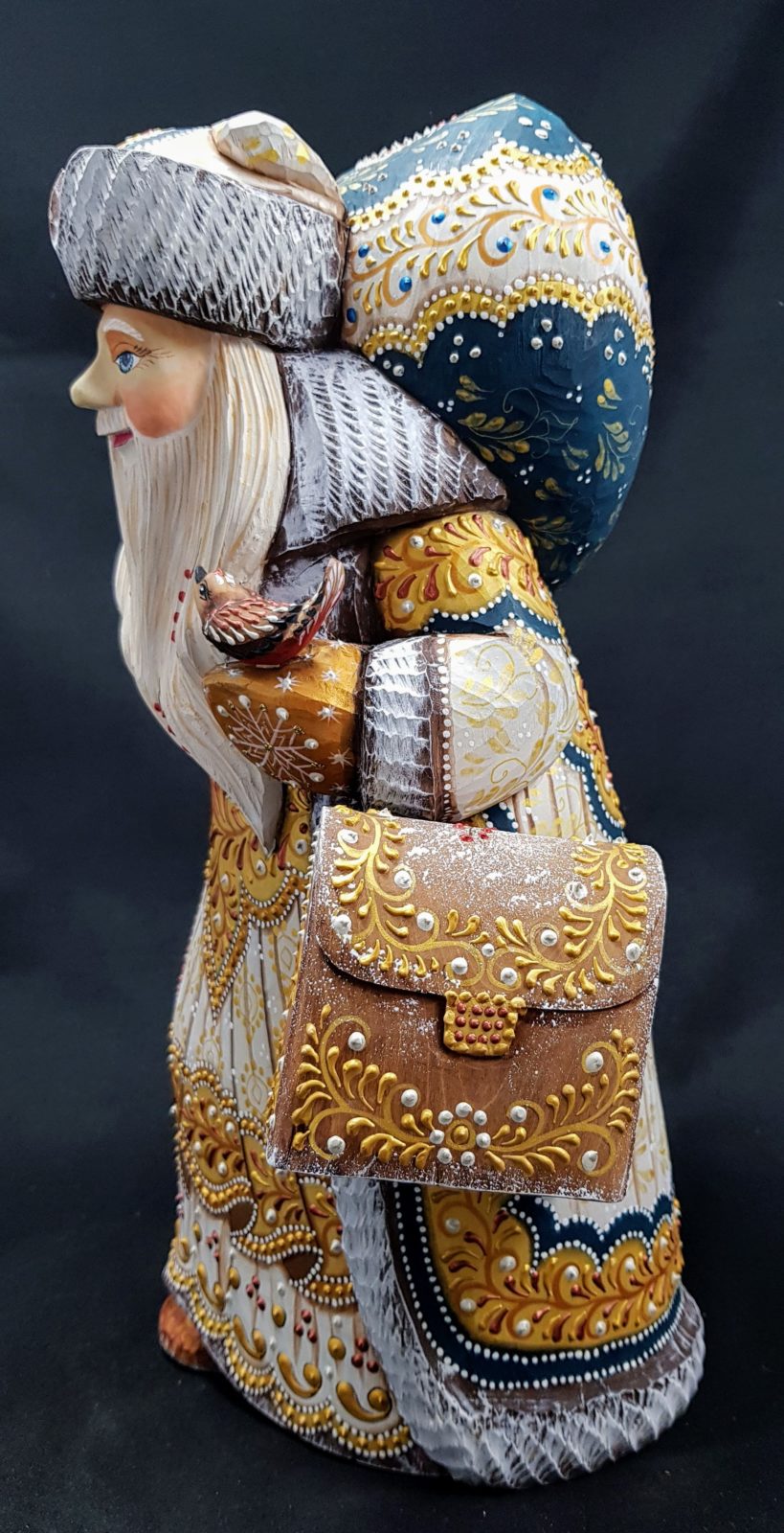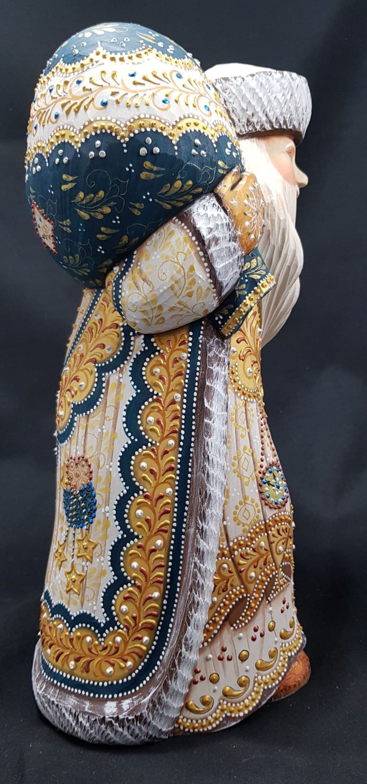 Père Noël droit blanc et or avec une très grosse hotte sur l’épaule et un beau sac en bandoulière