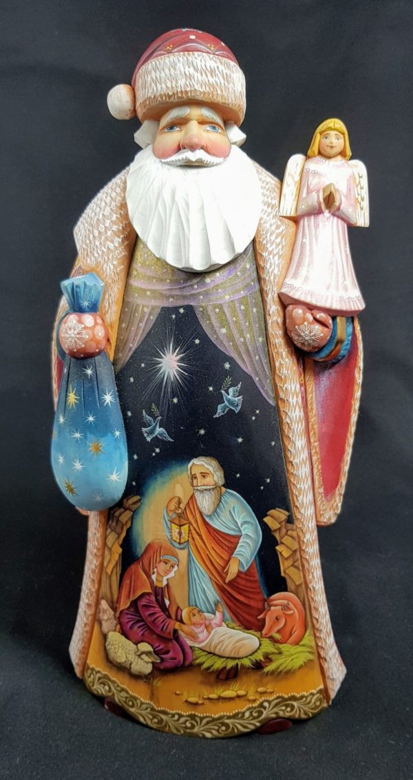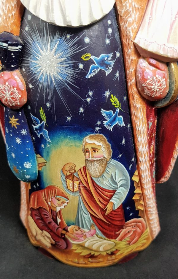 Very beautiful Santa along with the Holy Family on the front of his coat –