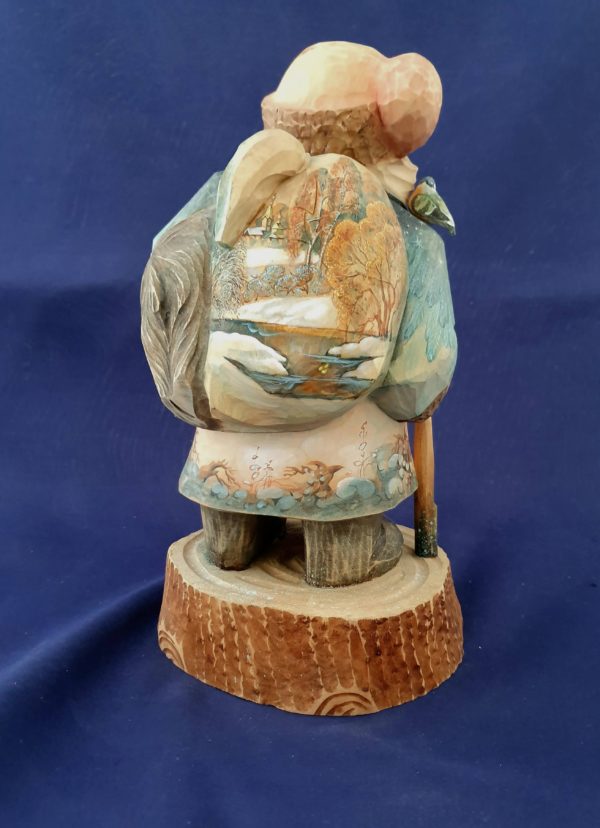 Très beaux dessins à l’aquarelle sur tout son costume – l’aquarelle fait que les rainures du bois sont visibles,