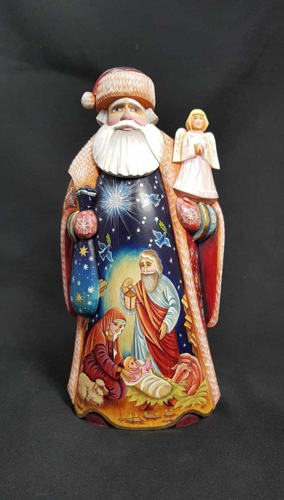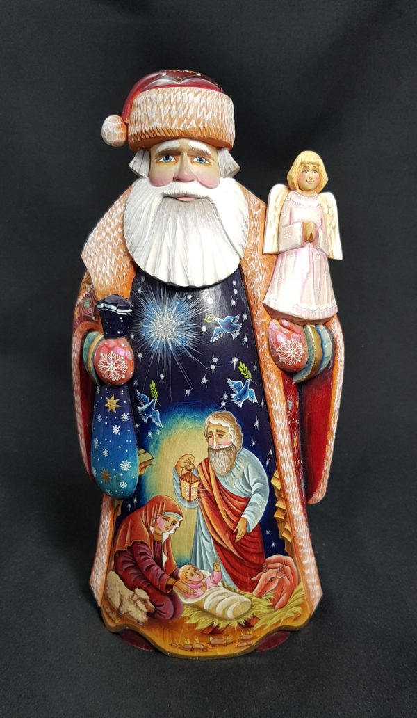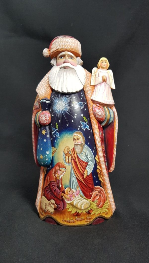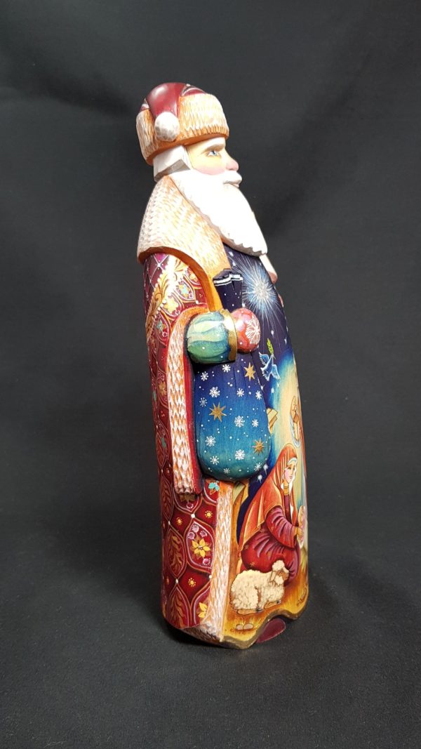 Very beautiful Santa along with the Holy Family on the front of his coat –