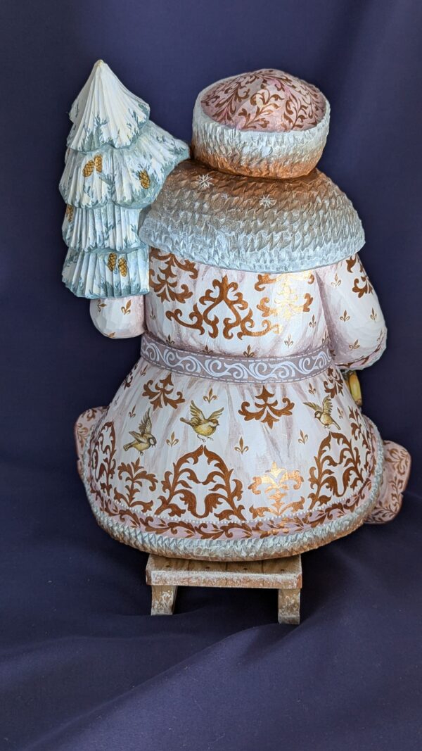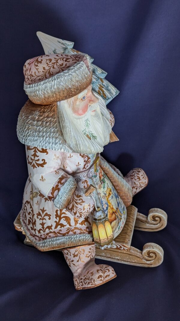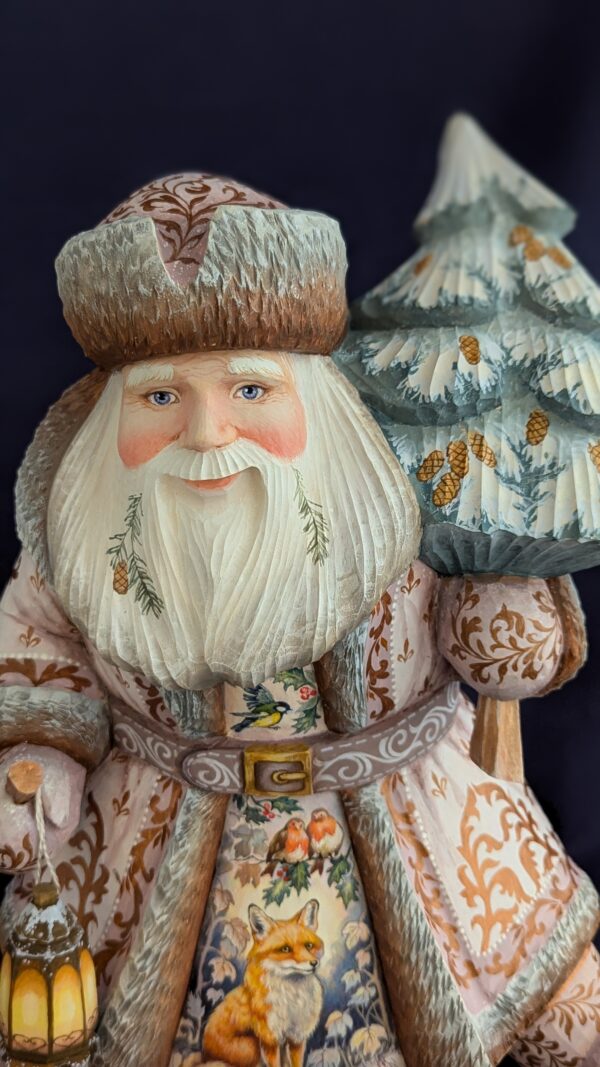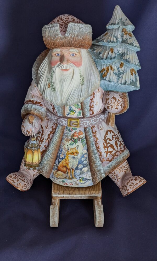 Very endearing Father Frost on his sleigh in the middle of the Russian forest with his friend,