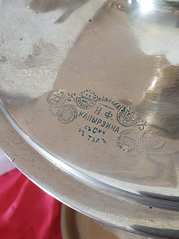 Ce samovar a été fabriqué par la firme KAPYRSINE, l’une des 4 plus importantes de TOULA, capitale russe du samovar.