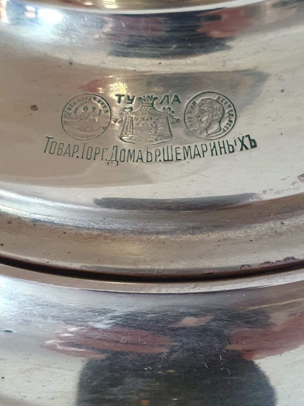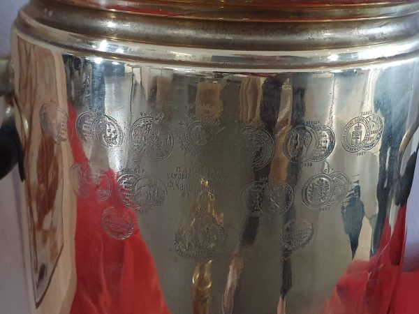 On retrouve l’emblème de la firme, ainsi que des médailles gagnées dans de prestigieuses foires et expositions à différentes époques sur le couvercle et le corps du samovar,