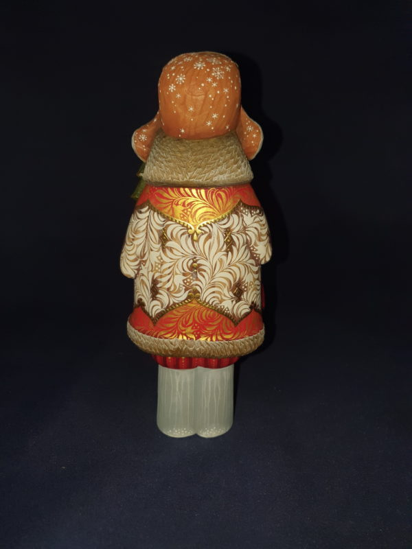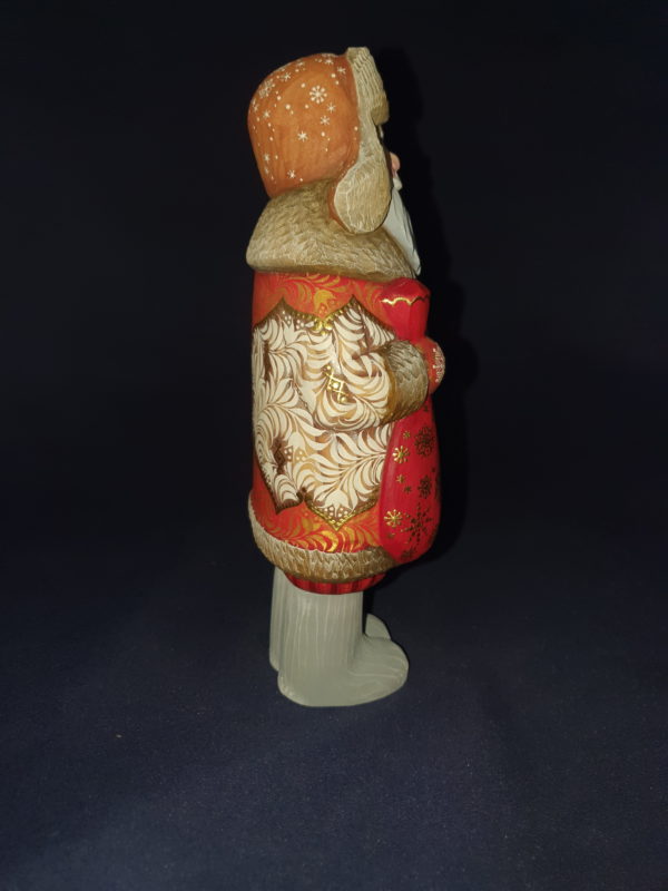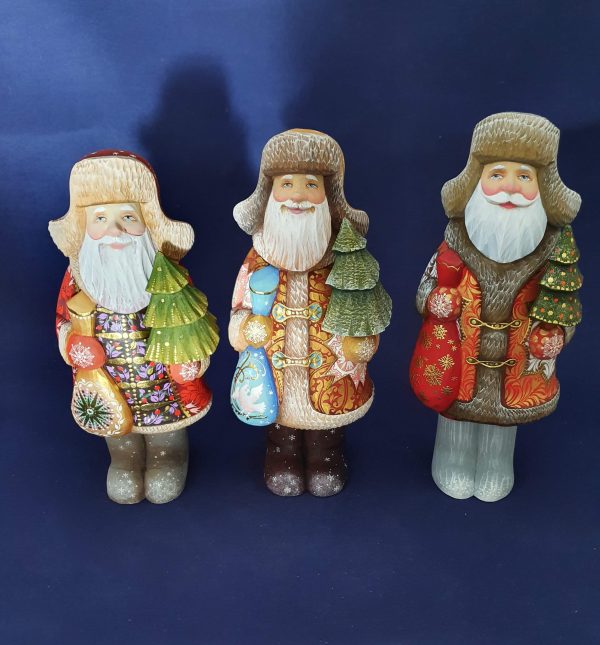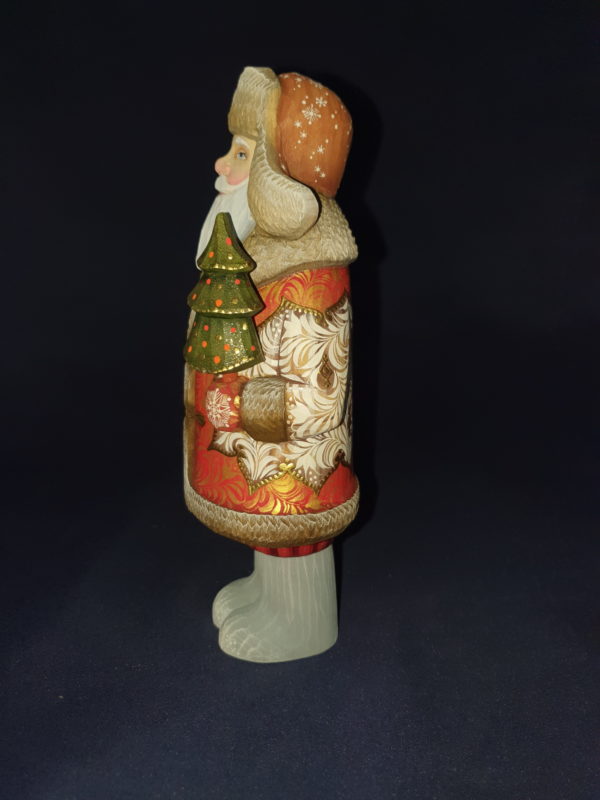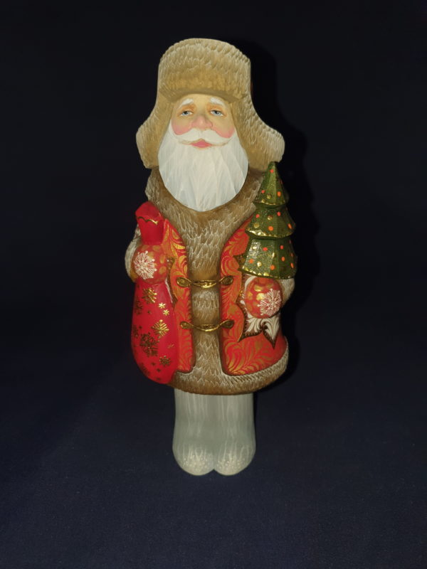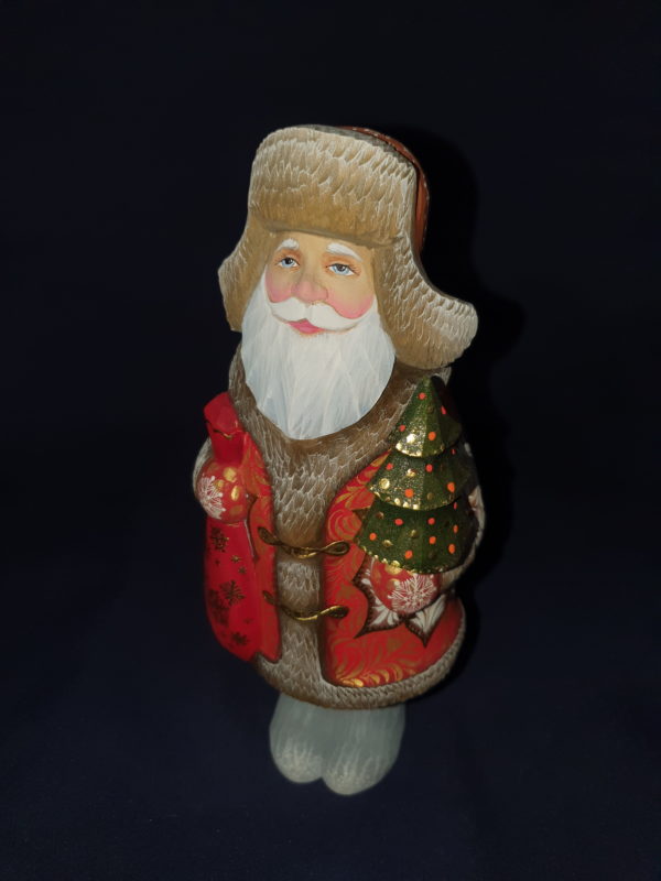 Typical Russian hat on his head, full bag in one hand and tree in the other,