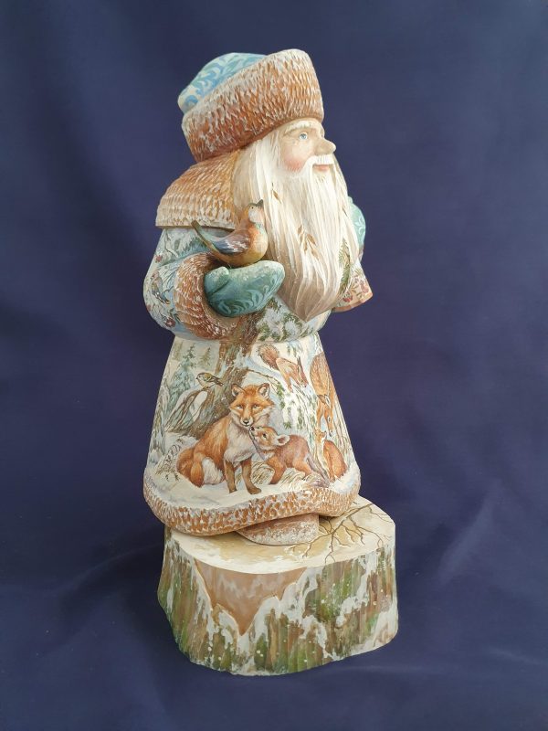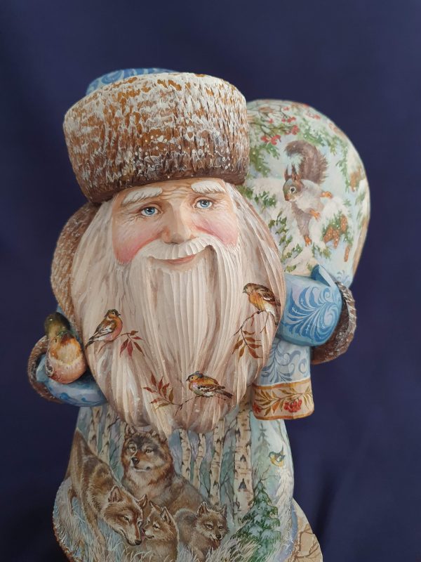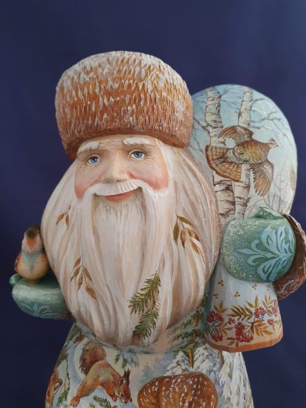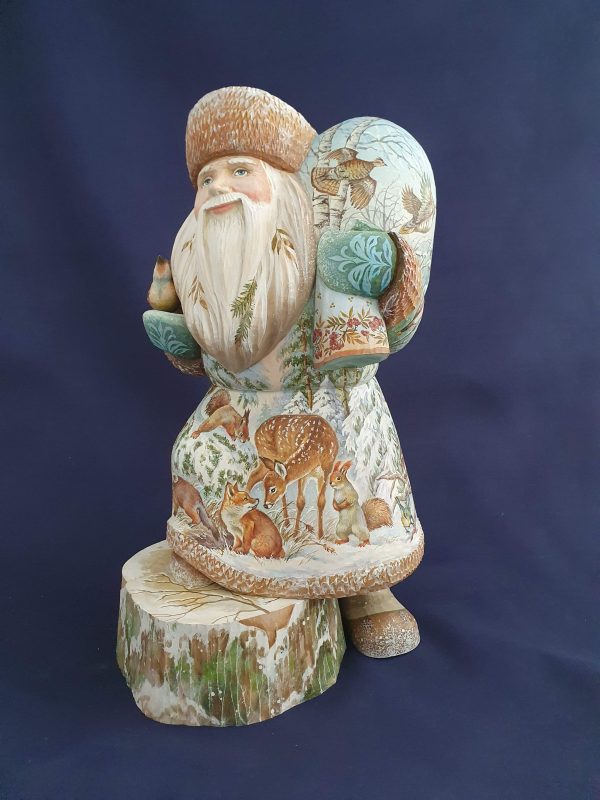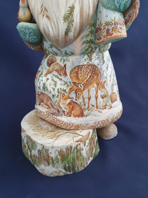 Galina a peint sur l’ensemble de ce père Noël une magnifique forêt et les animaux qui y vivent.