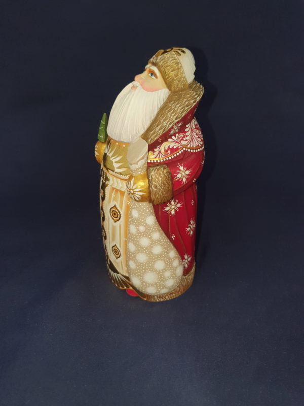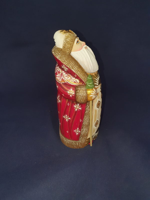 Beau père Noël droit dans un très beau manteau rouge, blanc et or – bois de tilleul.