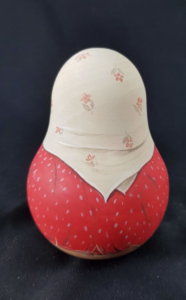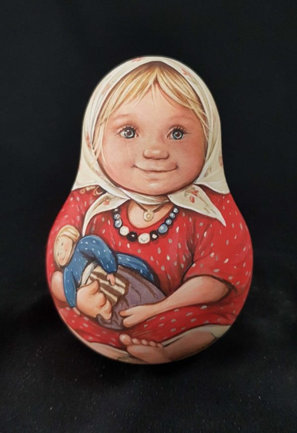 Adorable petite fille peinte sur un culbuto en bois avec sa poupée dans les bras- son visage semble prêt à nous dire quelque chose