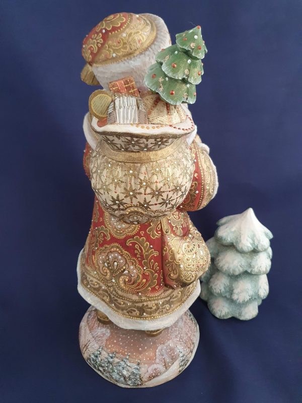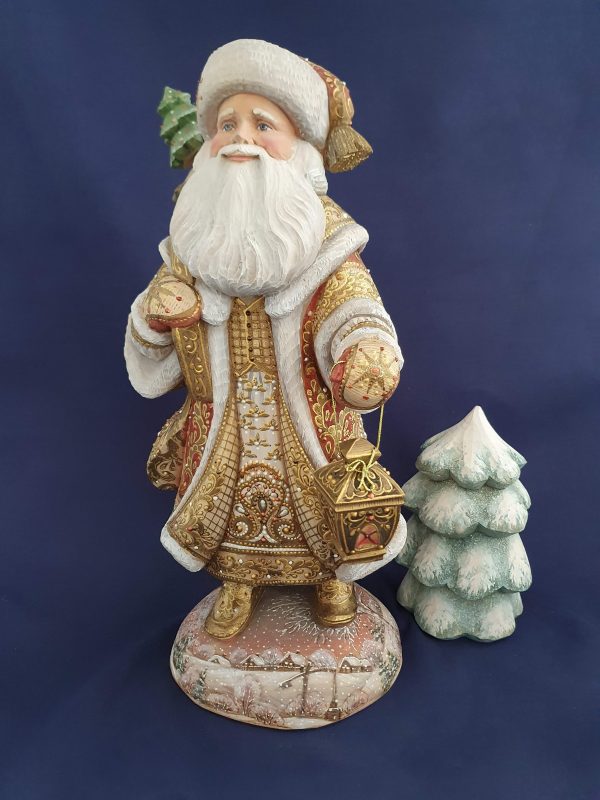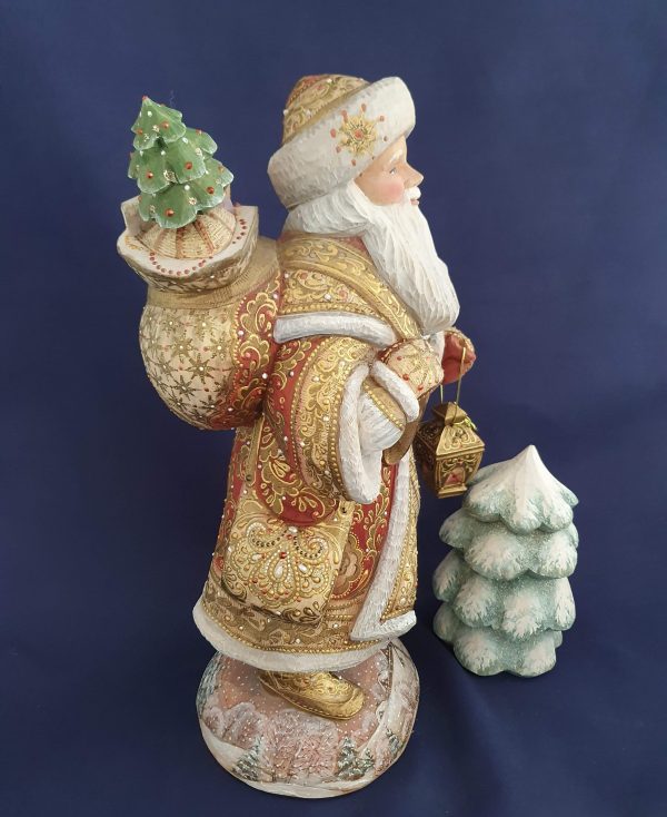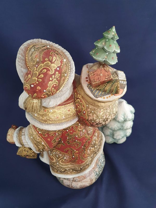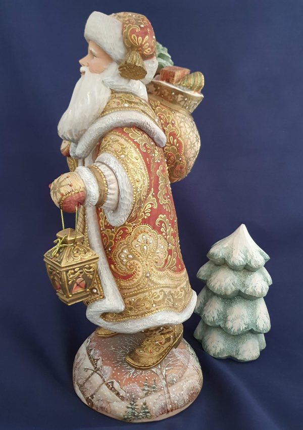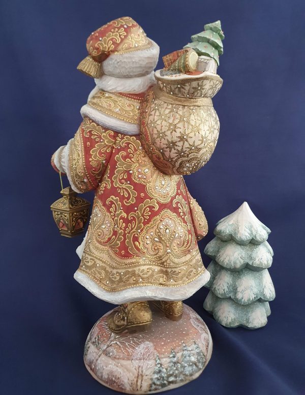 Il porte sur son dos une hotte pleine de cadeaux, une besace à son bras, et une lanterne pour éclairer son chemin.