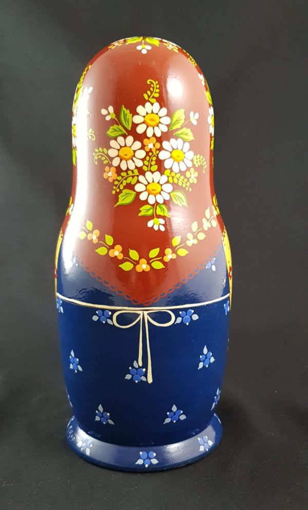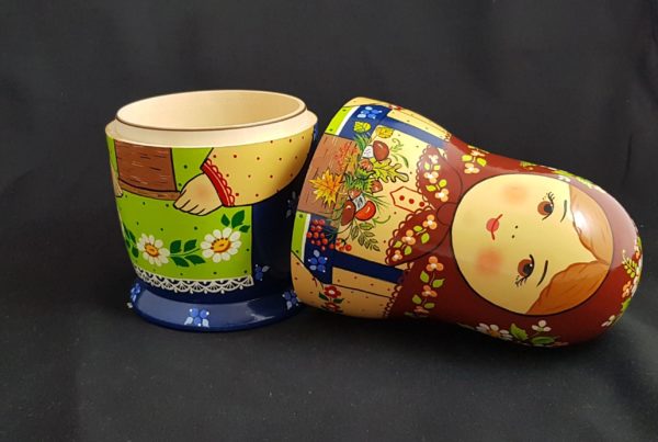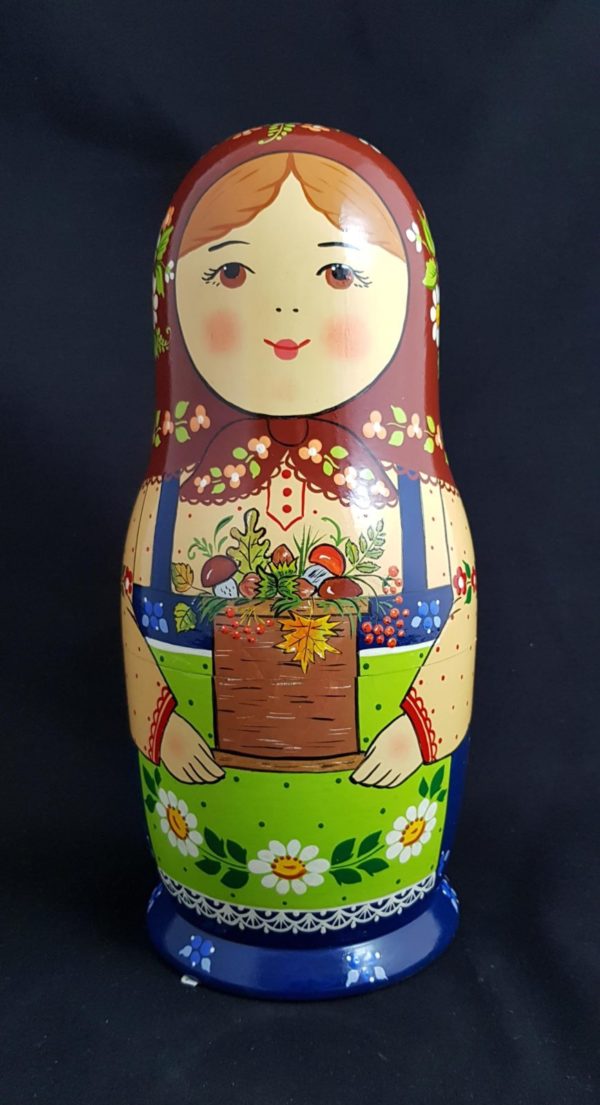 Matriochka boîte Très joli habit avec panier de champignons et de fleurs A vous d’y cacher des merveilles! Hauteur : 32 cm