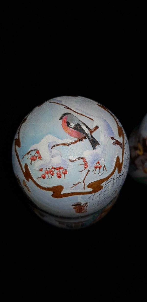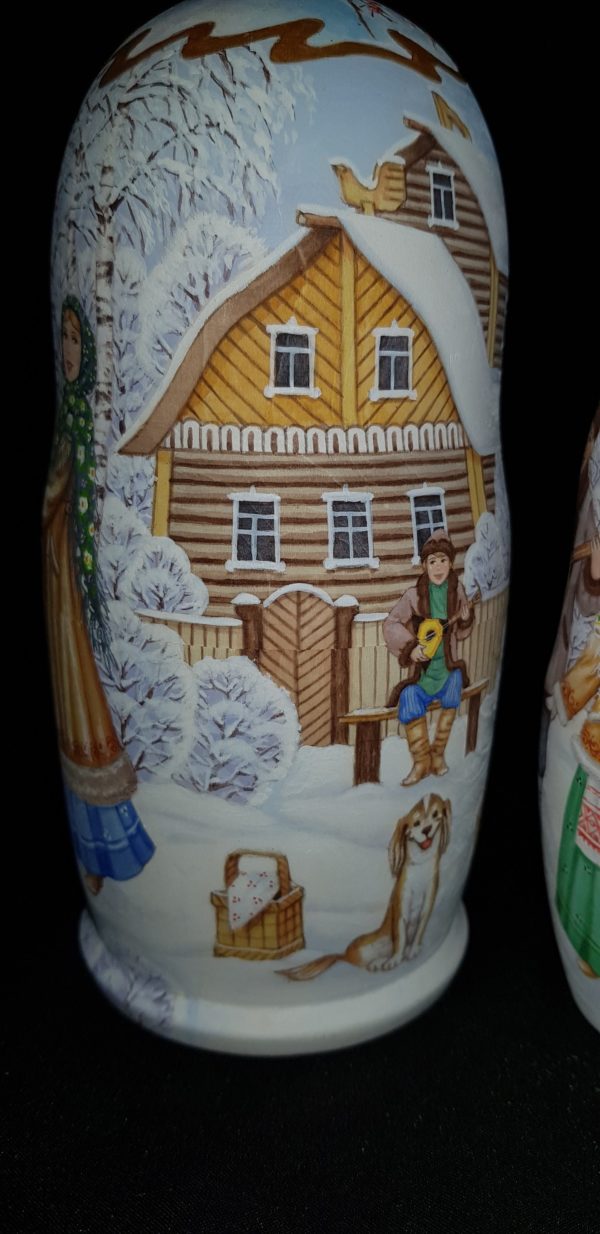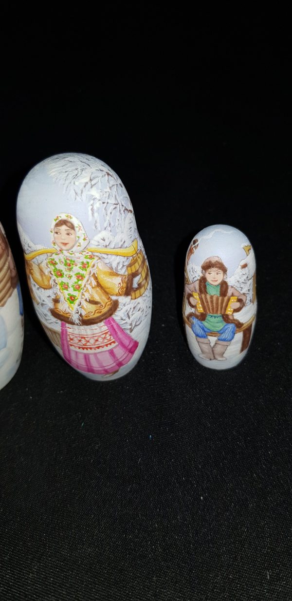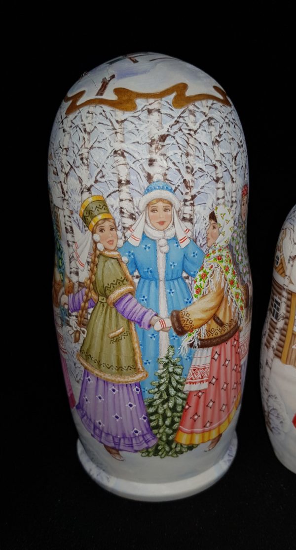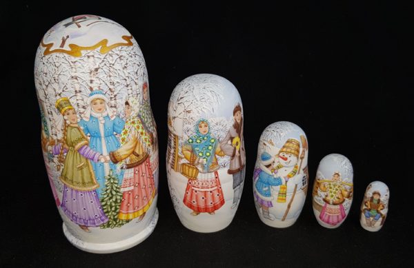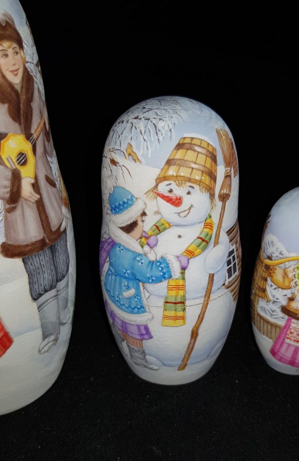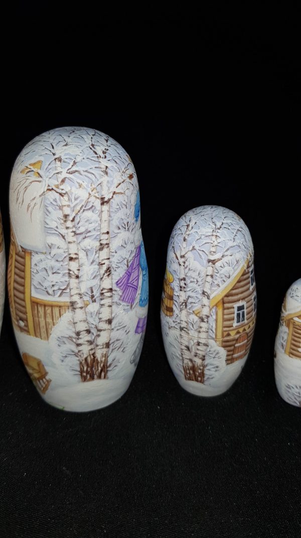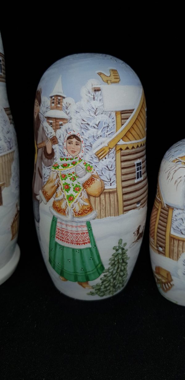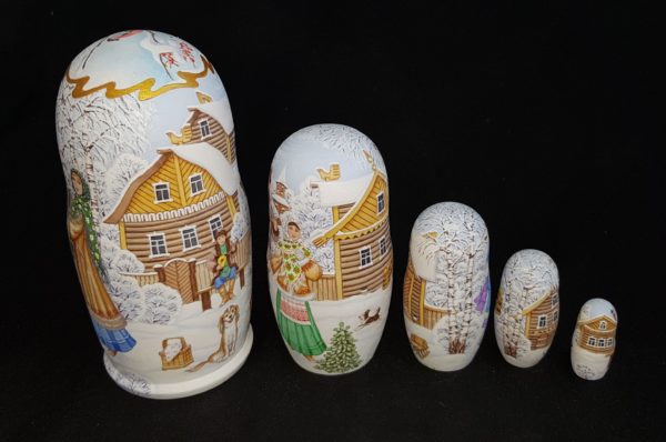 Très belle matriochka 5 pièces, qui vous emmène découvrir l’hiver russe dans un petit village sous la neige