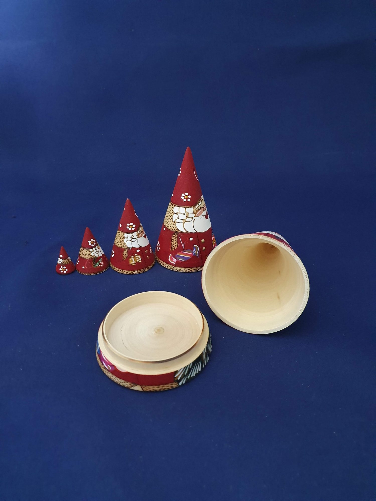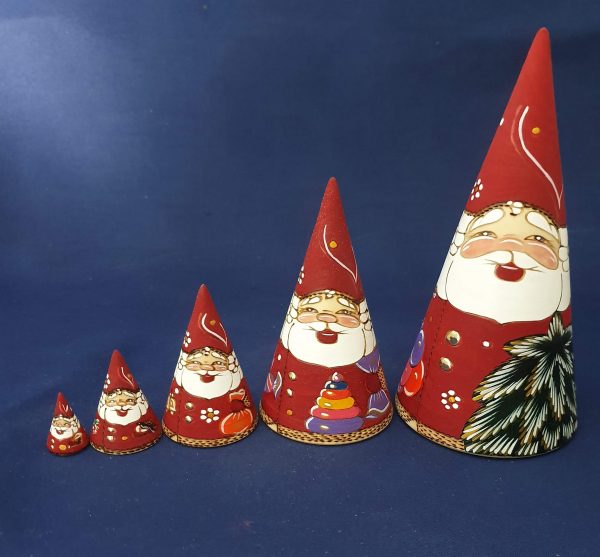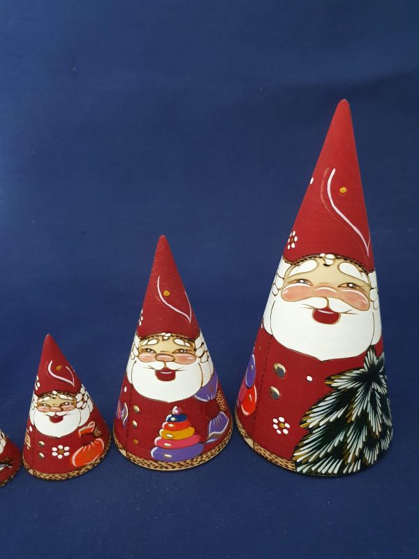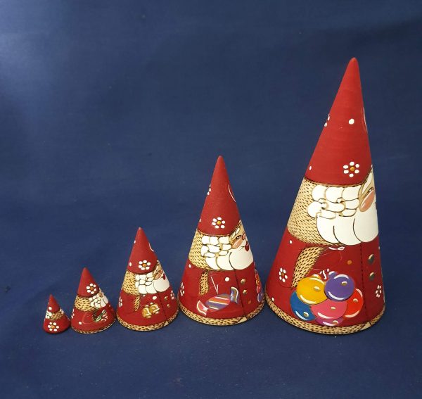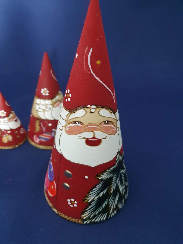 La forme de cône veut rappeler le sapin de Noël, et donne une originalité et une espièglerie superbes à ces pères Noël.