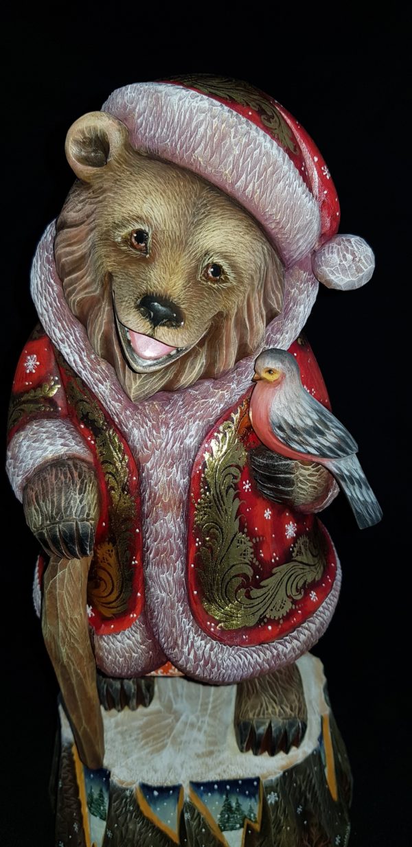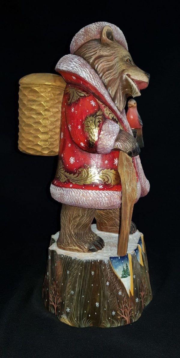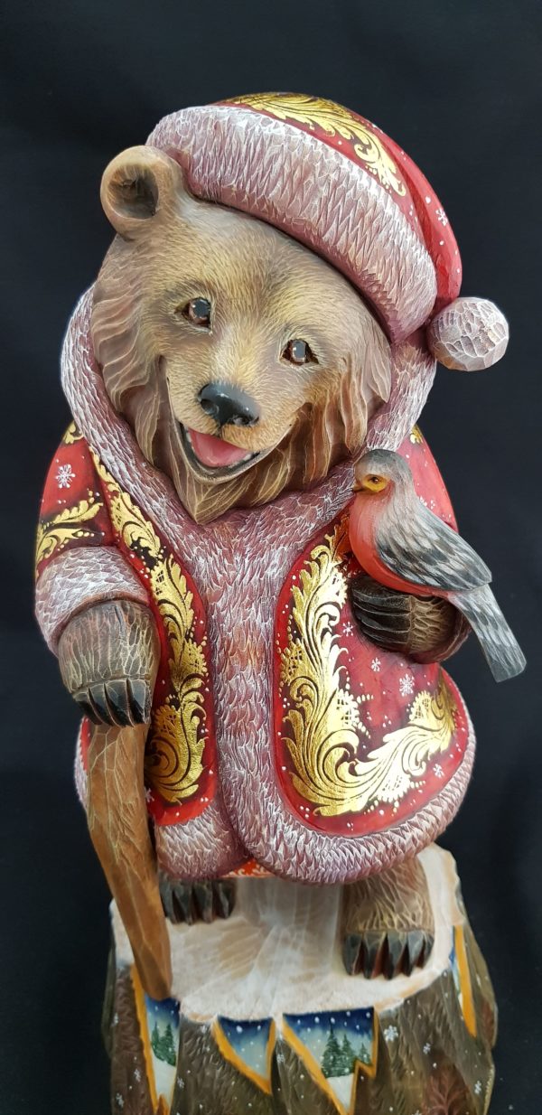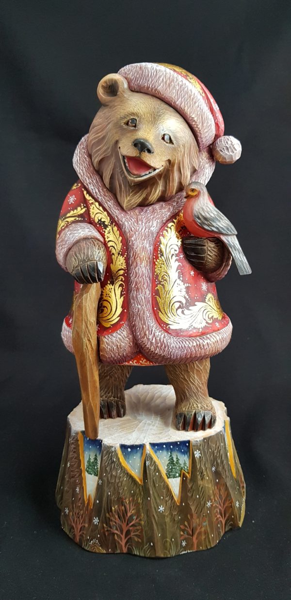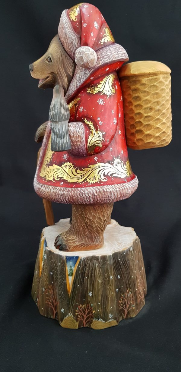 L’ours se tient sur un rondin de bois qui nous emmène dans la forêt.