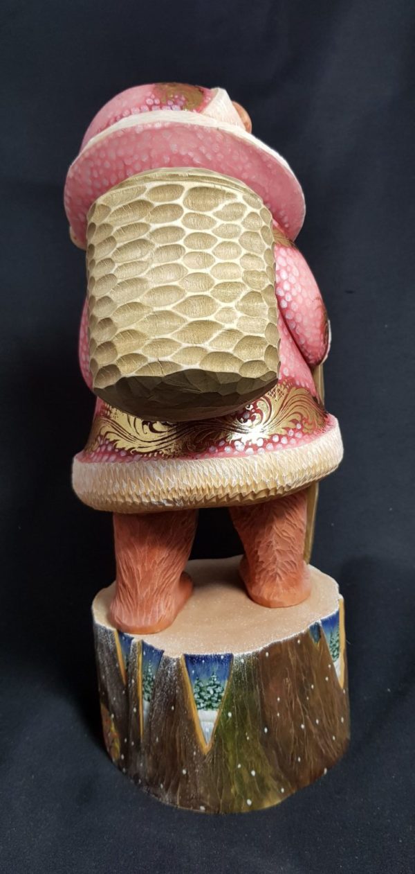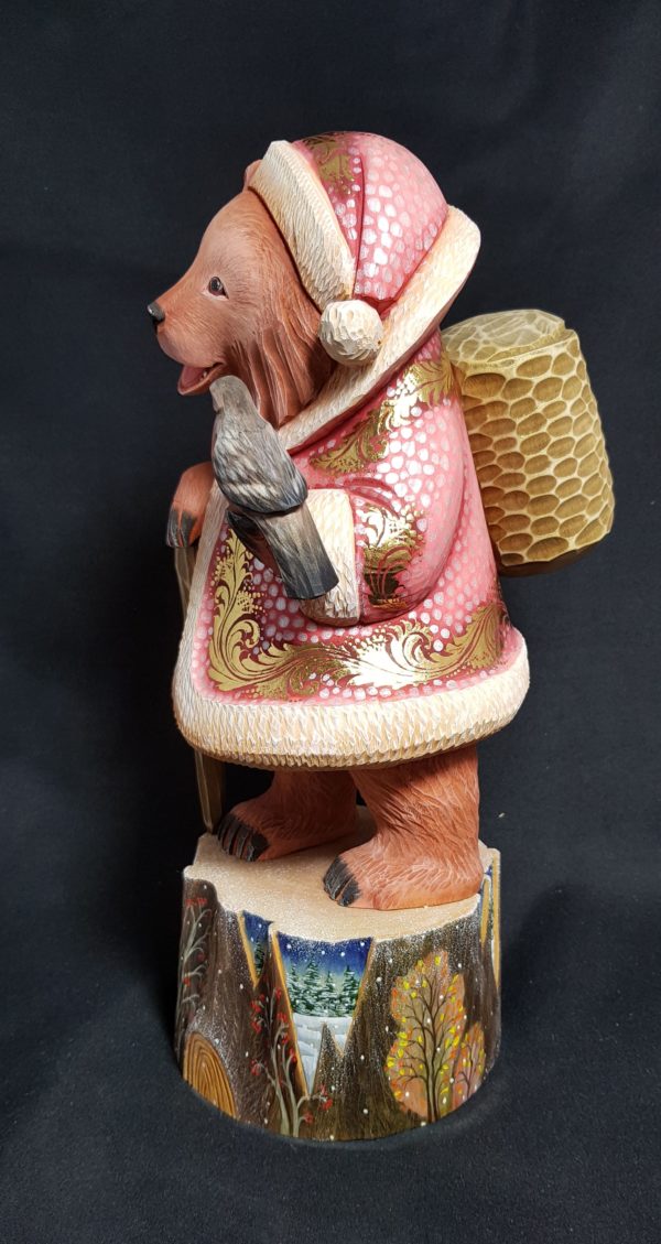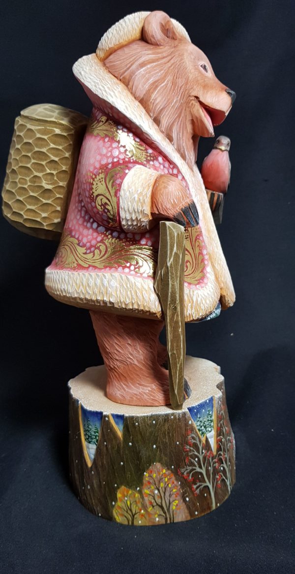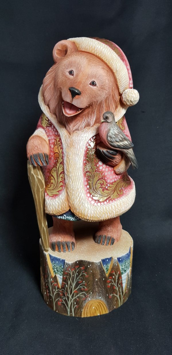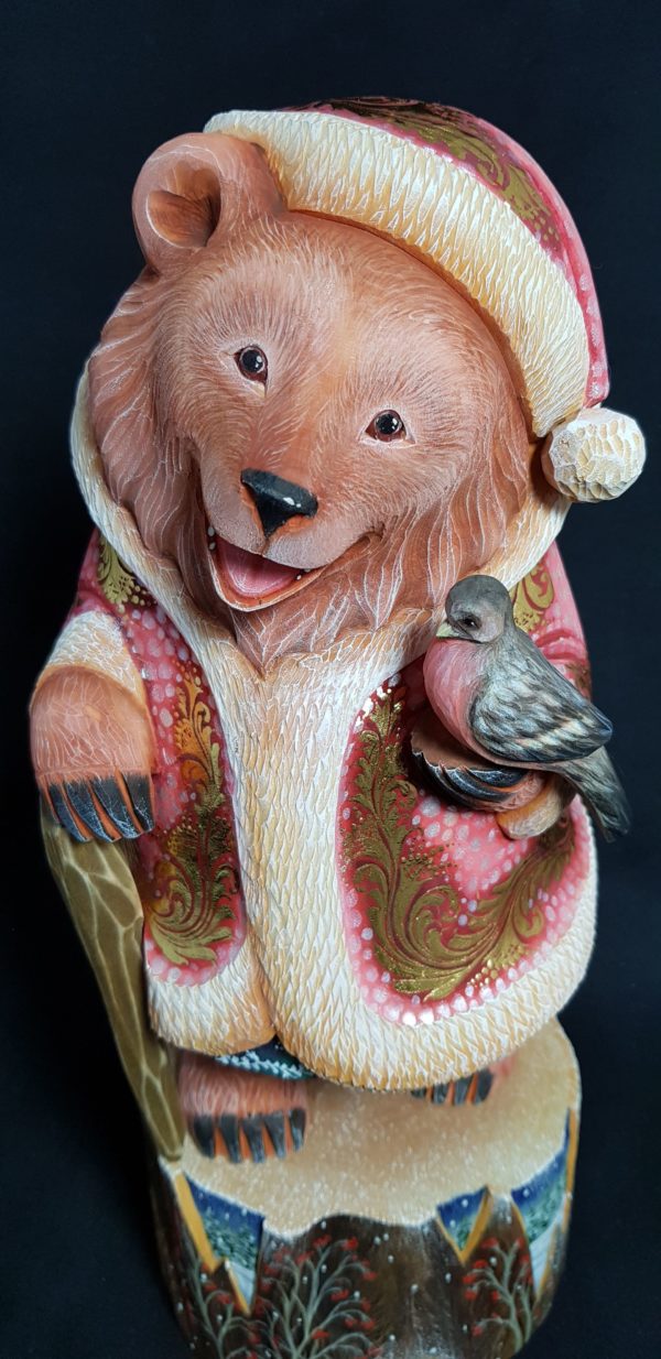 Magnifique ours sculpté dans du bois de tilleul avec un bel oiseau dans la main. Tout est fait mains.