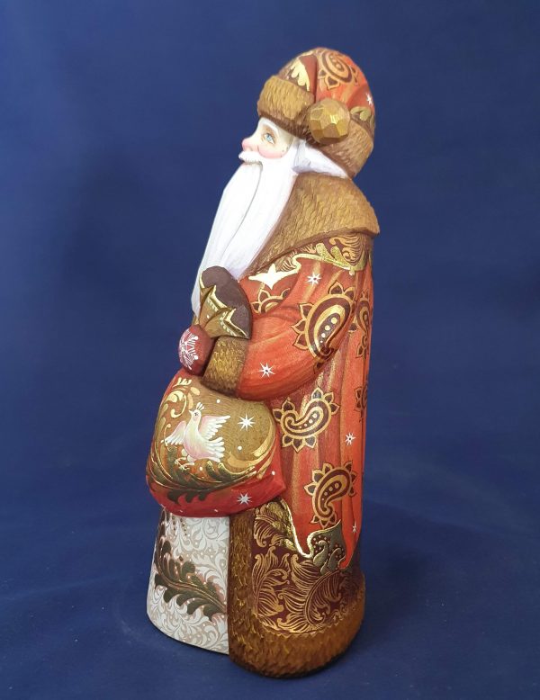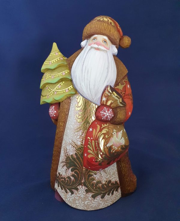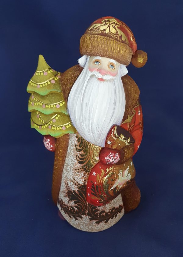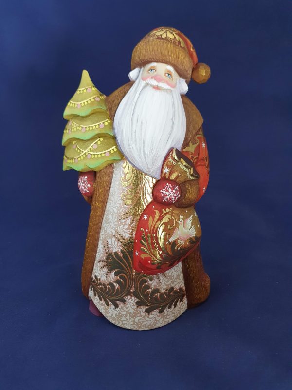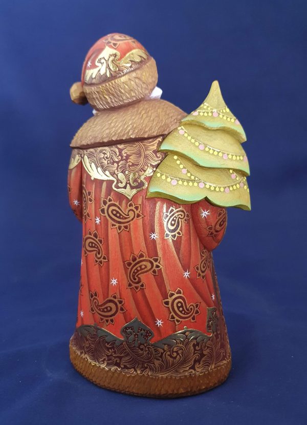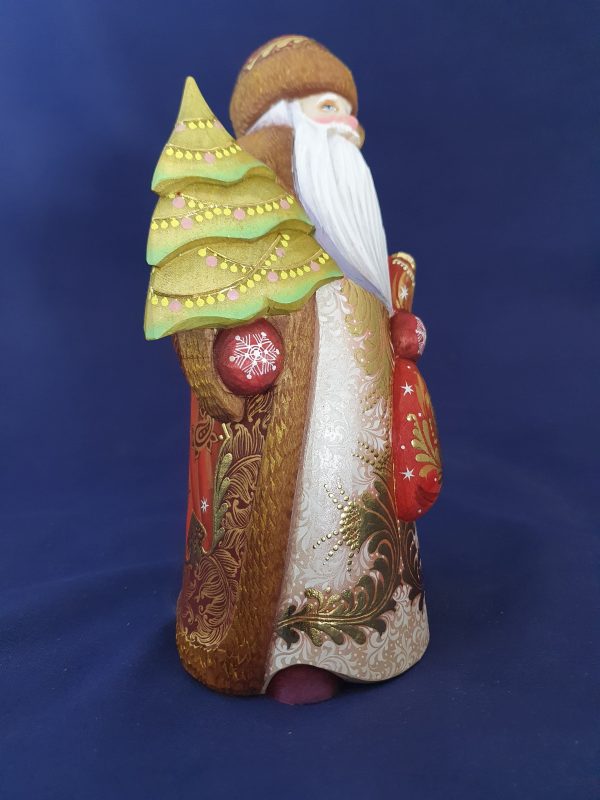 Joli père Noël en bois de tilleul, un baluchon dans la main gauche, un sapin dans la main droite