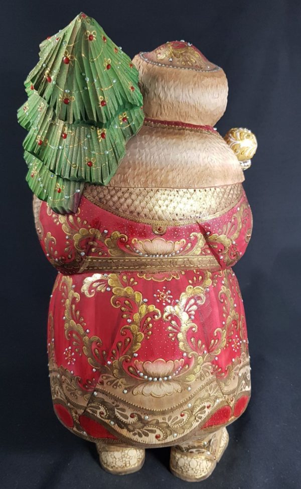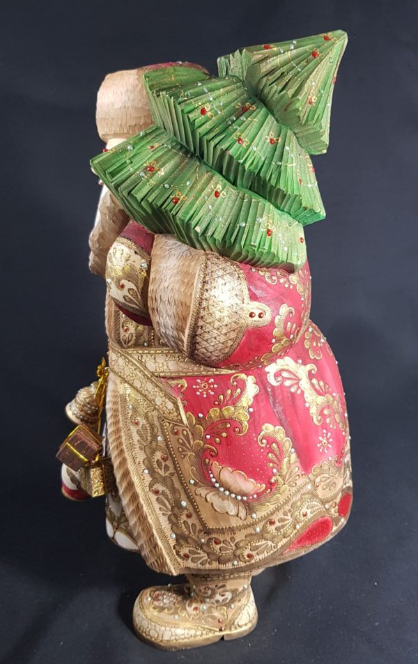 Sapin sur l’épaule et jouets accrochés à sa ceinture, il est tout sourire.