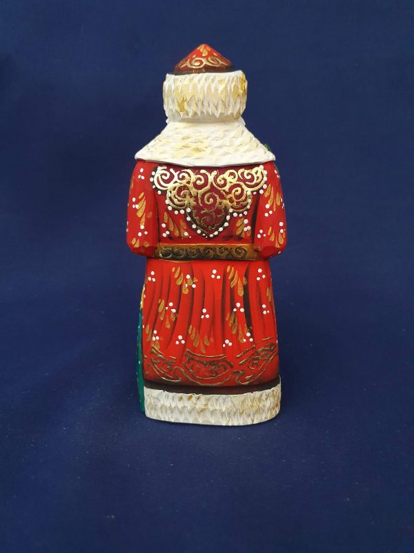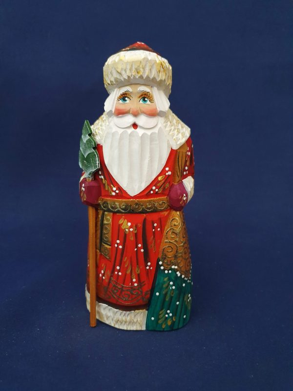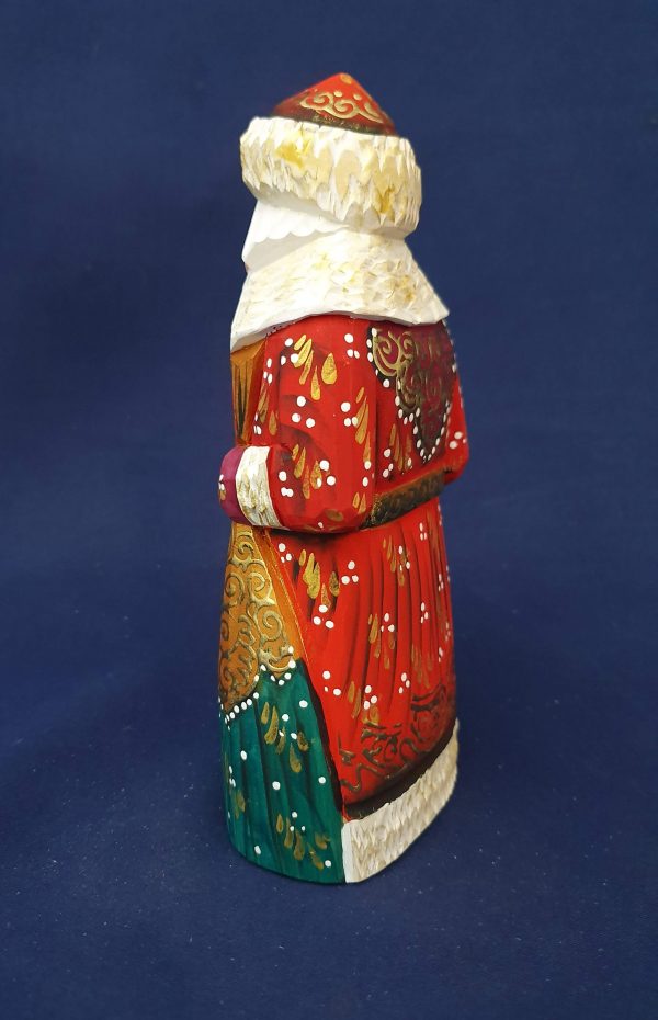 Joli père Noël en bois de tilleul. Manteau rouge et or – Hotte vert et or. Hauteur : 17 cm