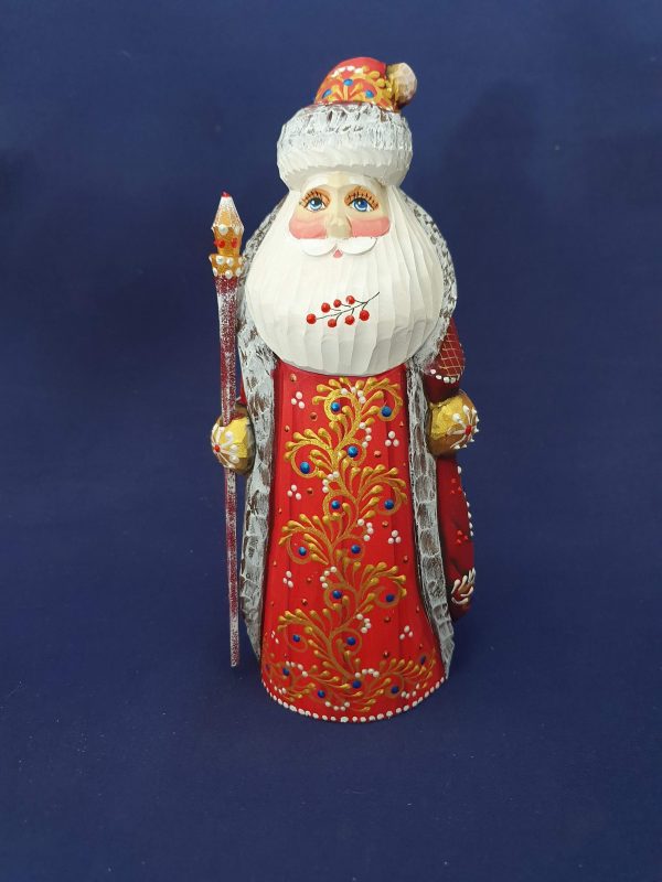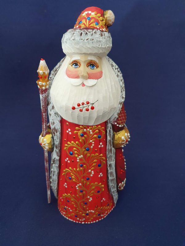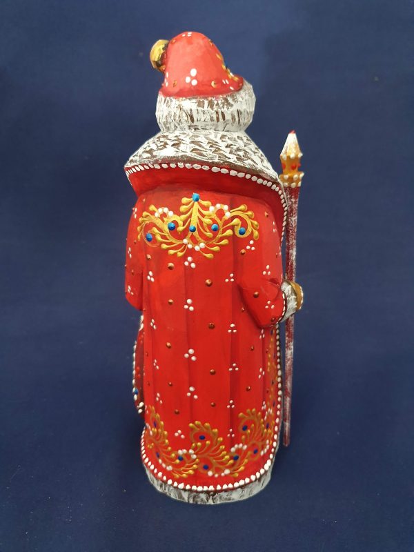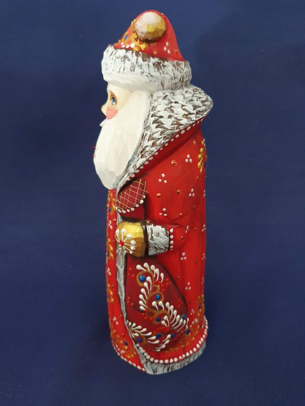 Joli petit père Noël en bois de tilleul – fait mains. Son manteau rouge et or lui donne belle allure. Hauteur : 19,5 cm