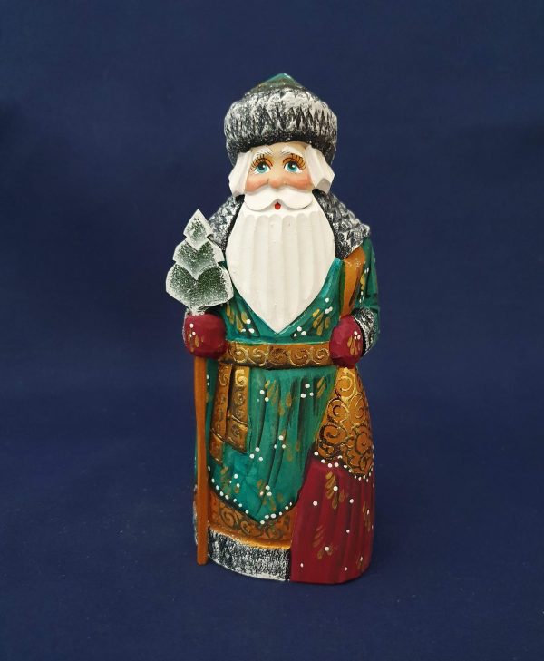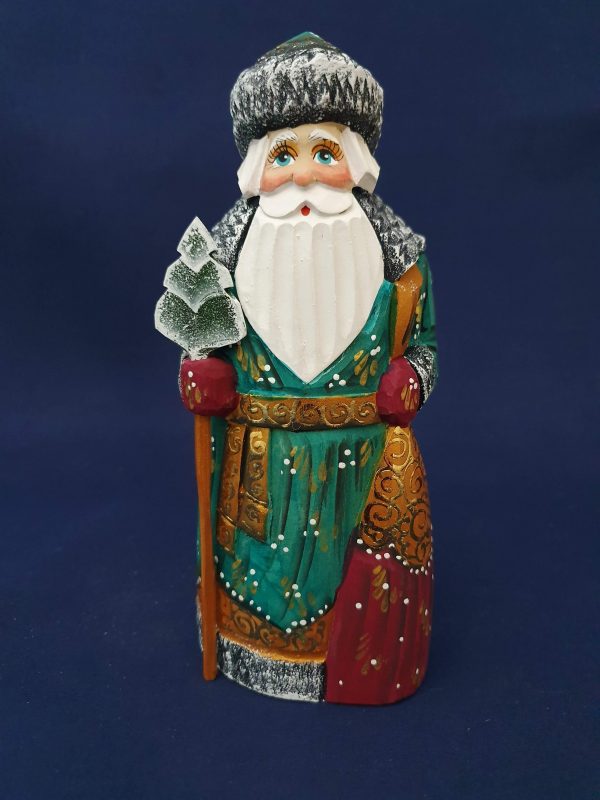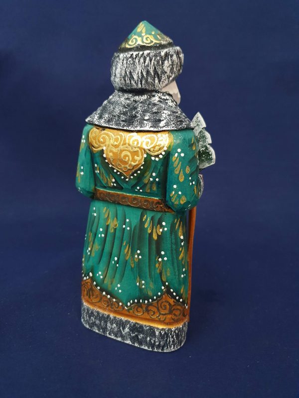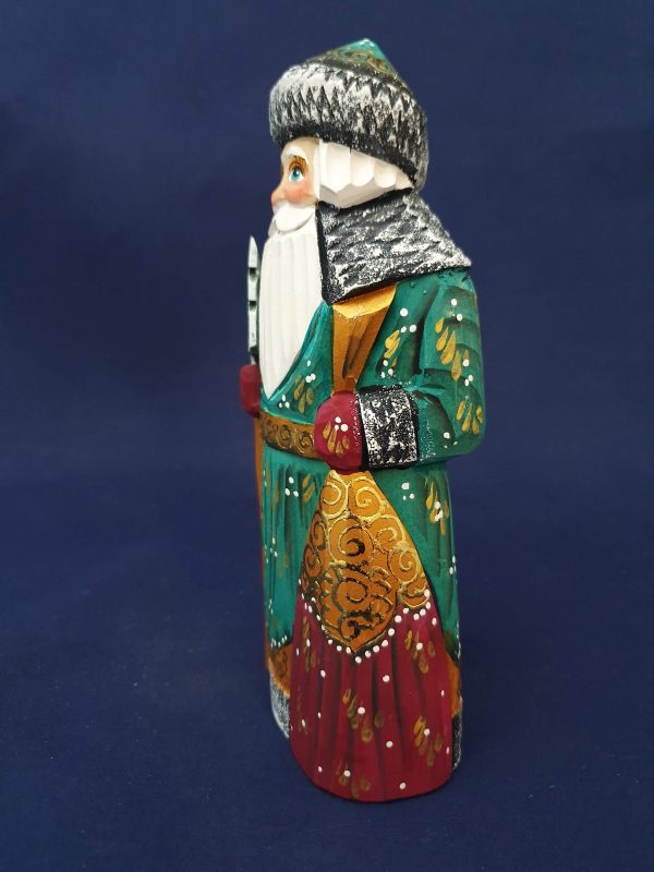 Joli petit père Noël en bois de tilleul. Manteau vert et or avec une grosse hotte rouge et or. Hauteur : 17 cm