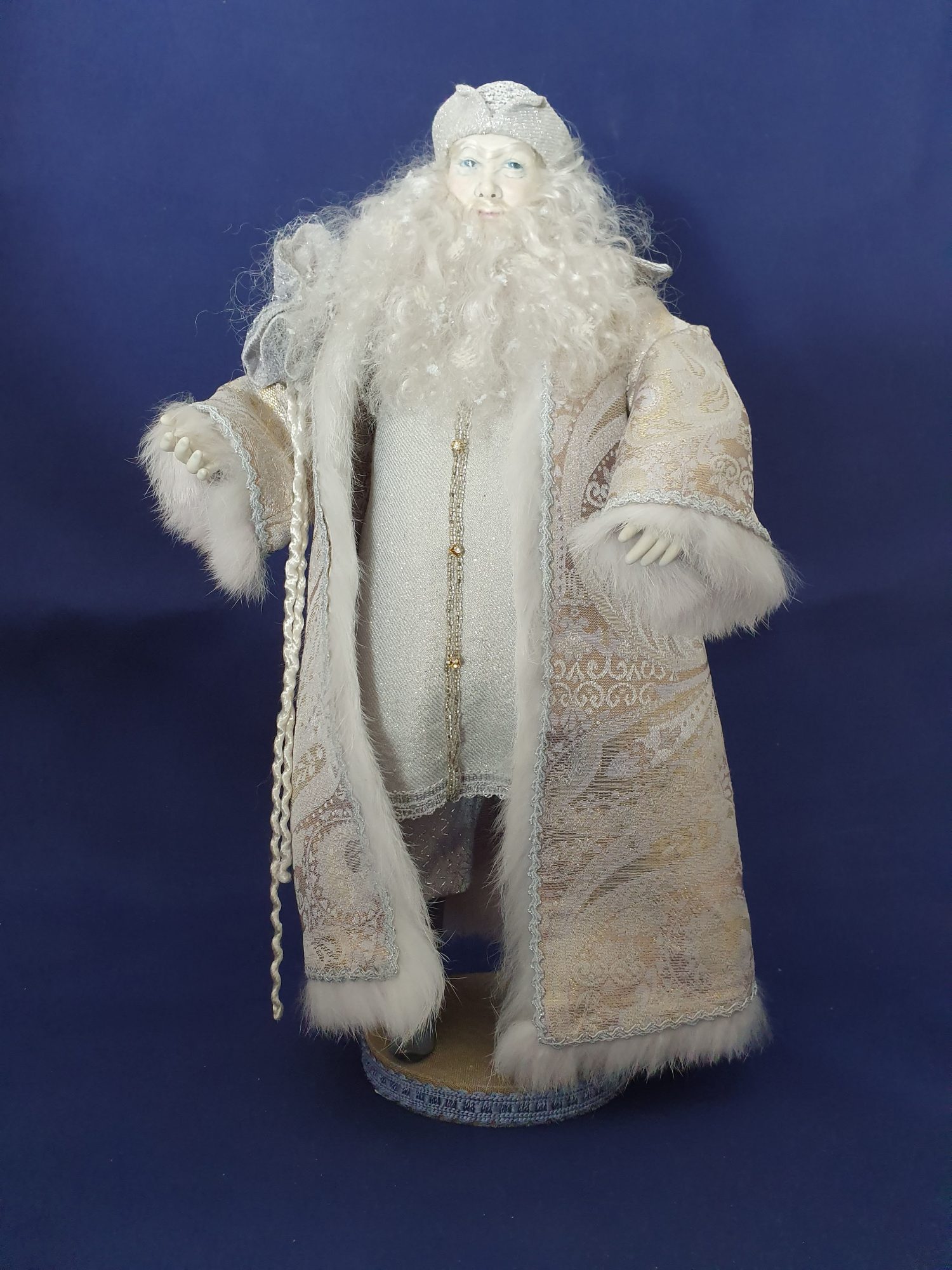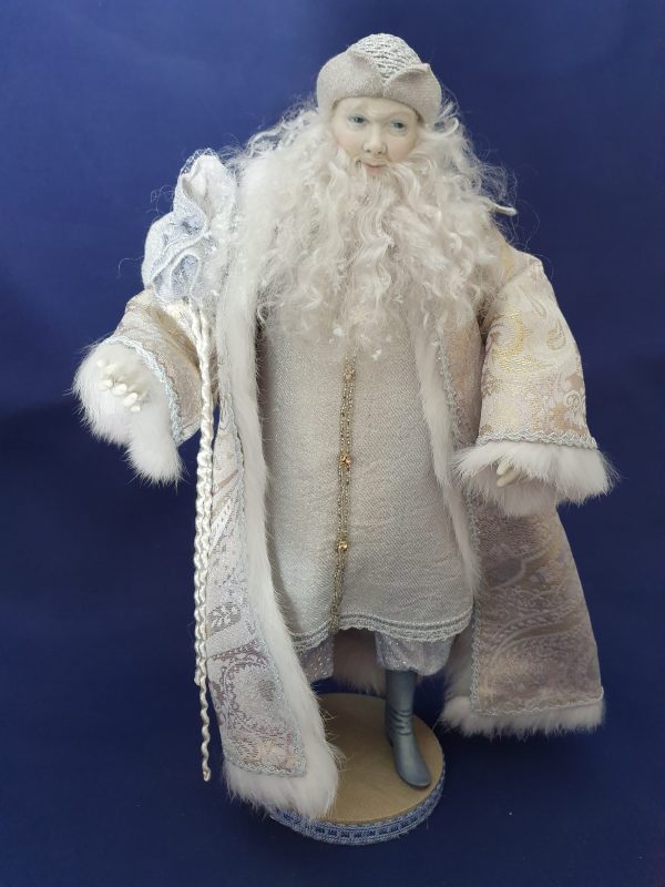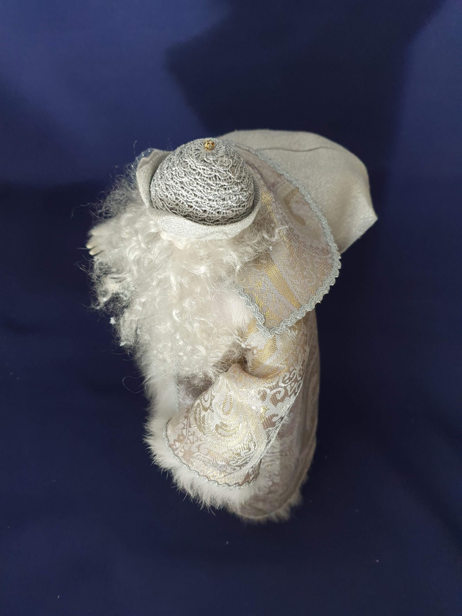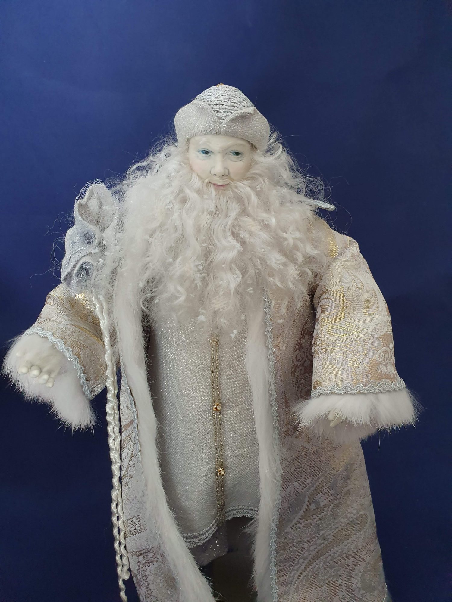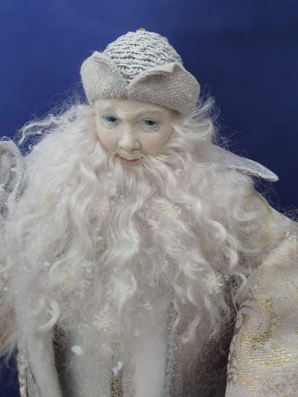 Sa longue barbe est remplie d’étoiles de neige.