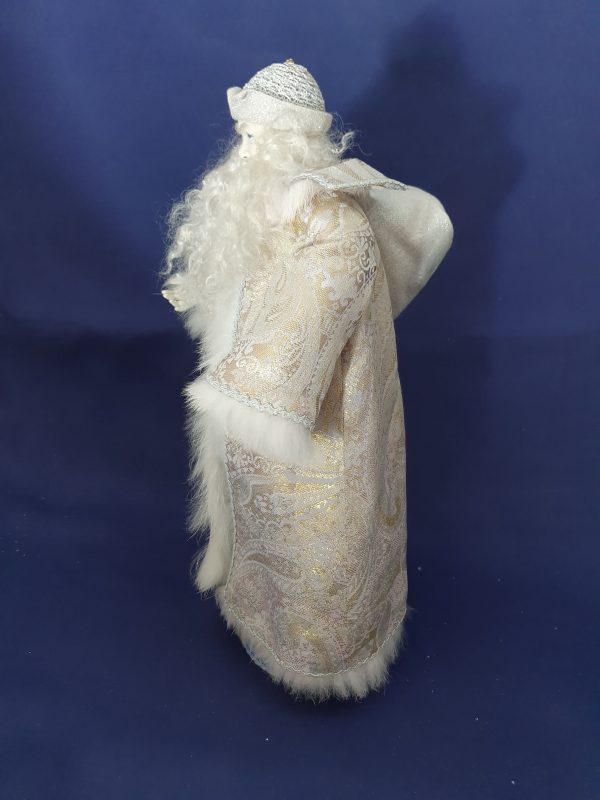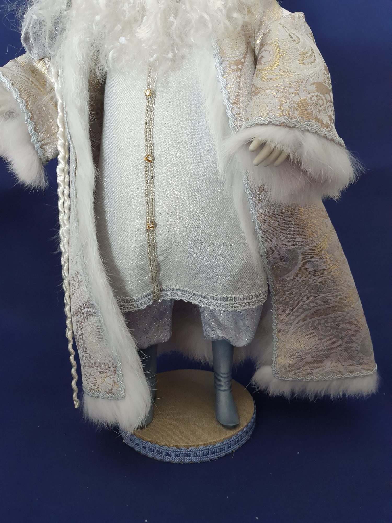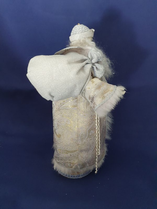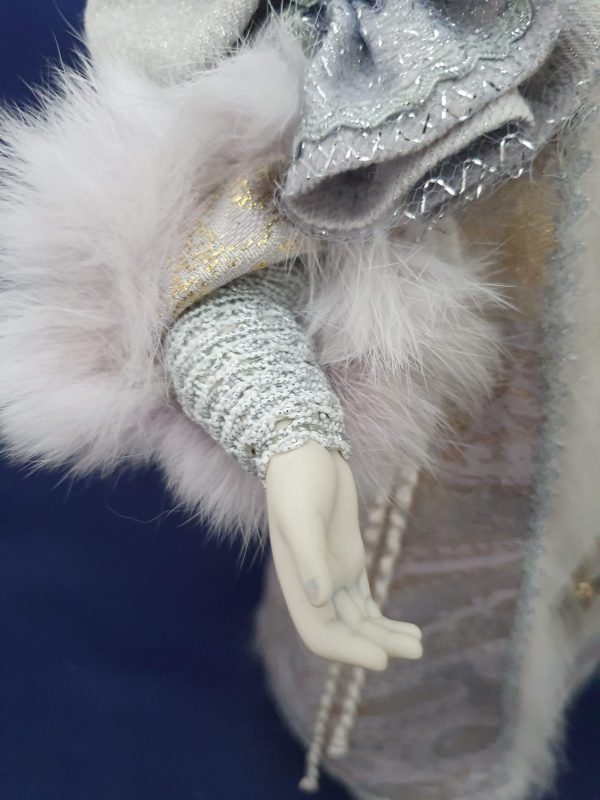 Son manteau dans les or, blanc, argent est bordé de fourrure.